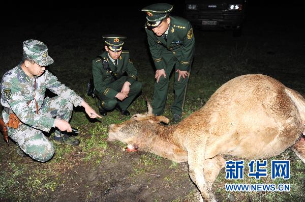 5月13日,吉林省珲春市马滴达边防派出所干警与珲春某边防连官兵查看野生东北虎袭牛现场。当日,吉林省珲春市哈达门乡马滴达村一农户家耕牛在二马沟附近山区放养时遭到野生动物袭击死亡,尾部肉体被食。珲春市野生东北虎自然保护区管理局专家通过测量脚印掌垫,确认系野生东北虎所为。