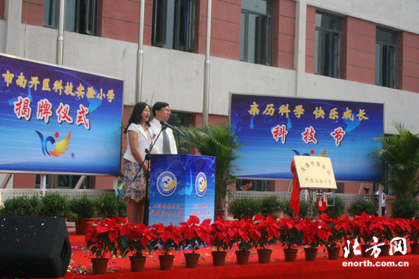 天津北方网讯:5月30日,南开区科技实验小学举行了更名揭牌仪式。仪式上,在VEX世界机器人锦标赛中获得结构设计金奖和最佳发明创意奖的机器人载着新校牌缓缓走上主席台,区领导冯恒达、谷云彪亲自为新校牌揭牌。