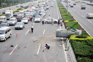 事发路段位于快速路临近水木天成小区一侧的车道上,一个水罐横在快速路中央隔离带上,两辆事故车停在距离水罐约30米远的天桥下。园林作业车紧贴着中央隔离带,隔离带的水泥墩上有明显的摩擦痕迹。大货车驾驶室前部的车体已变成“敞开式”,里面的方向盘已不见了。