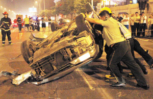 天津北方网讯:昨日凌晨,在卫津路与电台道交口处发生一起蹊跷的交通事故,一辆本田轿车四脚朝天翻倒在路面上,不远处还停着一辆大货车,车钥匙还没拔下来,但两车司机均不在现场。