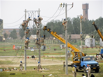 天津北方网讯:昨天下午,本市电力部门举行了近年来首次地震灾害应急技能实战演练。来自国家电网天津市电力公司的600名应急救援队成员演练了搭建临时配电网、为重要客户提供应急电源、地震废墟破拆救人等科目,应急发电车、带电作业车、应急灯塔、卫星电话等新型装备逐一亮相。