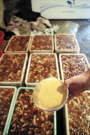 昨天9:00左右,天津市质量技术监督稽查总队多名执法人员来到了这个小院。听到有陌生人叫门,里面的妇女就是不开门。几经周折,进到院内的执法人员发现,院门口的窝棚下堆满了大量正准备切割的猪肉皮,大盆内刚刚煮好的肉皮冻中还躺着多只苍蝇尸体。进到室内,执法人员发现角落里堆满了大量工业盐以及已经使用了半袋的不明黄色颗粒。为了查明这些不明颗粒的成分,质监人员现场用热水将部分颗粒融化。但随着冷却,这些溶液很快凝固并呈现出肉冻的状态。原来这些不明黄色颗粒,就是国家在冰激凌、肉皮冻中明令禁止添加的工业明胶。此外,黑作坊内使用的糖稀也已经严重变质,散发出异味。不仅如此,执法人员在小院里发现了另外两间同样是生产肉皮冻的黑作坊,且同样使用了工业明胶和工业盐等禁止在食品中使用的添加剂。初步检查发现,仅这三家肉冻黑作坊内的成品就重达2吨左右。令大家惊叹的是,体重75公斤左右的执法人员双脚踩上去,这些肉皮冻居然也没有破碎。