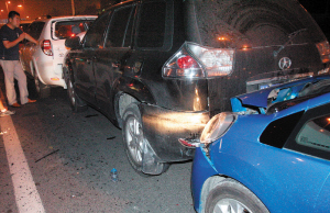 天津北方网讯:前天22:10左右,津滨大道与泰昌路交口处,由市区往外环线方向发生一起交通事故,由于追尾导致五车连撞。一辆蓝色飞度轿车上的男司机表示,由于当时开车走神了,没有注意前面的车辆,结果导致发生事故。目前事故正在处理中。见习记者王曾 摄影齐琦