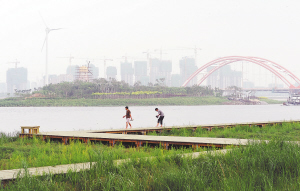 近日,永定新河南侧河堤的木质栈桥已经建成,将成为市民休憩、观光的好去处。该栈桥全长约3公里,为天津最长的木栈桥,成永定新河河口的景观带。图为市民行走在永定新河的木质栈桥上。本报记者兰飞摄