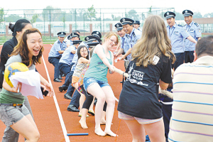 公安红桥分局芥园派出所民警近日应邀来到惠灵顿国际学校,与学校师生、驻区企业开展警民共建联谊活动,以同看红色电影、举行警民运动会等方式加深友谊,建设和谐警民关系。图为民警与国际学校师生、驻区企业代表进行拔河比赛。