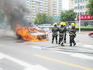 此时,很多汽车都纷纷从非机动车道上缓慢行驶着,不一会儿,2辆消防车赶了过来。消防人员用水枪将大火扑灭。所幸没有人员受伤。记者孙瑜摄影报道