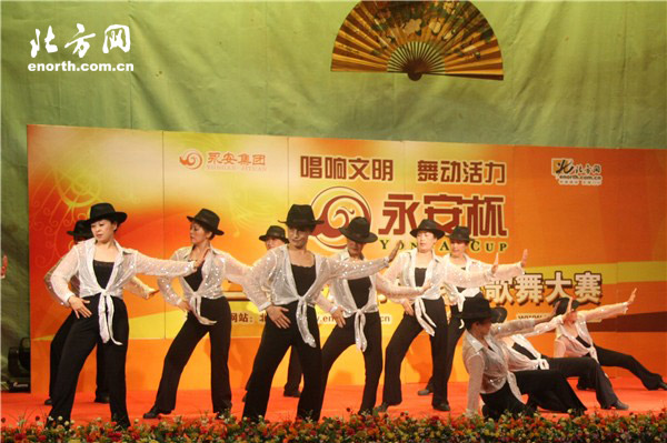 8月1日,由天津市文明办主办,北方网、天津永安集团永安公墓承办的“永安杯”第二届天津市中老年歌舞大赛南开海选在天津市南开区文化宫举行。在南开区舞蹈组的比赛场上,惊现16位着装统一的迈克尔·杰克逊,各个帅气逼人。而当她们摘掉礼帽时,记者才发现,原来是16位上了年纪的女选手。