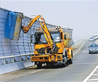 ●为加强本市道路、桥梁的全面清洗和养护,市道路桥梁管理处陆续引进一批桥梁设施综合清洗车和微波综合养护车。投入使用后,有效提升了桥梁的清洗速度和质量,达到全国领先水平。(上图)