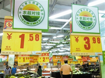 采访中,记者遇到了天津家乐福超市总经理助理陈鹏。据他介绍,超市推广农超对接以来,已和全国400多个农业合作社签约,每天仅从山东一地运到家乐福的蔬菜就达五六吨。现天津周边区县有20多家农业合作社和超市签约,从菜园直接给超市供菜。卖场内农超对接商品有蔬菜、水果、禽蛋、水产、干货等达150多个品种,其中蔬菜类农超对接占的比重最大,达40%左右。华润万家超市负责人李金介绍,截至目前,超市已分别与天津东丽区华明镇、宝坻区、蓟县、河北省文安县、山东省沾化县建立农超对接基地5个,正在洽谈秦皇岛、盖州项目4个,产品涵盖各种城市居民生活必需鲜活农产品。未来两年超市的农超对接基地数量将扩增至14个,预计日销售量达500吨,直采比例达70%以上。