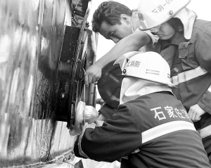 | -消防官兵正在封堵泄漏的甲醇罐。 |