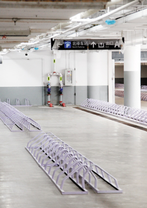 然而,这个自行车库的入口与机动车库入口基本相同,只有走近后才能看清楚“自行车库”的字样。按时间估算,记者共花费约45分钟才找到该存车处。在车库内部,记者看到,硕大的存车场没有一辆车。通过北停车场A区,记者找到几位保安人员,他们表示,目前,自行车库可能还没有投入使用,因此没有人负责看管。当记者问是否还有其他自行车存车场时,他们则表示,只有这一个存车场,不论市民从哪个方向来,今后都该将车存在这。