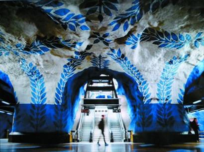 | 资料图:北欧的一个地铁站,将地基内原有的花岗岩凿成巨大的穹顶和石柱,绘上巨型天蓝色树枝树叶,再打上灯光,营造出梦幻世界。 |