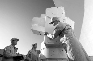 酒泉卫星发射中心指挥控制站技术人员正在维护光测设备。