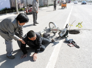 被绊倒的韩大爷说,当时他正骑车电动车往天津站方向走,路边有个工地,门口停着不少大型工程车,这在一定程度上影响了他的视线,因此没有看到前方的无盖井,骑着电动车就冲了上去,结果连人带车摔在了地上。