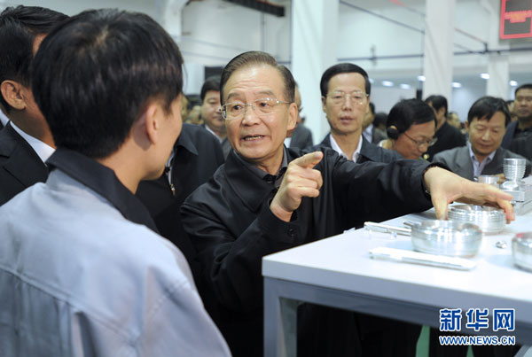 | 10月24日至25日,中共中央政治局常委、国务院总理温家宝在天津滨海新区调研,并主持召开天津、内蒙古、江苏、山东四省(区、市)经济形势座谈会。这是10月24日,温家宝总理在中航直升机有限责任公司考察。 |