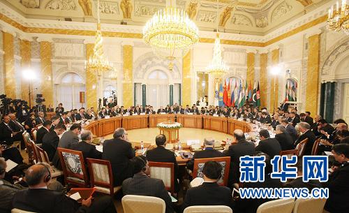 | 11月7日,中国国务院总理温家宝在俄罗斯圣彼得堡出席上海合作组织成员国总理第十次会议并发表讲话。这是会议现场。 |