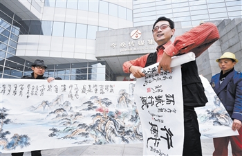 沙拓夫有个习惯,就是每到一处,都会在随身携带的一张长卷上写下一首诗,并且到当地的邮局盖上邮戳。这张长卷上已经留下了很多地方的印记。昨天中午,他在今晚大厦前留下了在天津的第一个地标印记。随沙拓夫一同来到今晚大厦的还有“爱我中华行”活动的成员草根歌手阿贝哥、传播中华武术的盛飞龙、用牙齿拉飞机的奇人李国顺。