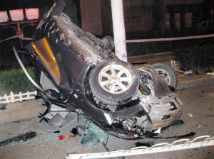 天津北方网讯:昨日凌晨1时20分,消防部门接到报警称,南开区长江道与南丰路交口发生一起交通事故,一辆轿车发生翻车,四脚朝天翻在路边,一名女子被困车内无法逃生。