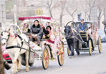 天津北方网讯:昨天,由三辆装点亮丽的欧式马车组成的婚车车队,沿五大道缓步前行,吸引了众多路人的目光。已成为津门一道流动风景的五大道游览马车,不仅受到外地游客青睐,更吸引了不少年轻人租来迎娶新娘,别有一番情趣。