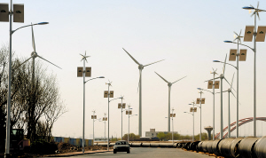 | 中新天津生态城风电、光伏发电设施比比皆是,该地区许多公共设施用电、生活用电相当大比例已经用上了洁净清洁能源。风电、光伏发电设施已经成为街景。本报记者 王涛 摄 |