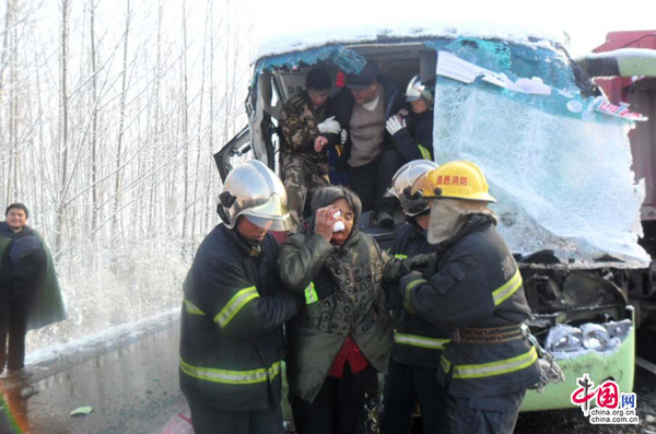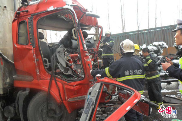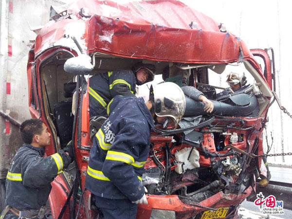 | 2011年12月8日,山东省济青高速青岛至济南方向106公里处,因雪天路滑发生多车连环相撞事故,造成多名群众被困。潍坊消防支队昌邑大队紧急出动2台救援车辆、16名官兵携带抢险救援器材火速赶到现场处置。 |