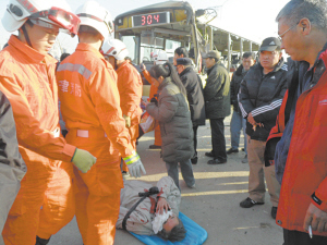 一名事故发生时坐在公交车司机后面的乘客尹大爷告诉记者,当时车里坐了满满一车人,突然就听见砰的一声,车内就被烟尘充满,自己眼前什么都看不清了,头撞上了公交车门,腿被绊了一下,胳膊也摔伤了。一名中年男性胸前一片血迹,被120急救人员送上急救车。一名12岁的男孩也伤得不轻,被担架抬上车。一名看起来只有五六岁的孩子,被碎玻璃刺伤,家长抱着送往医院。此外,车上还有几名伤员,有的腿部受伤不能动,有的脸上被擦伤在流血。