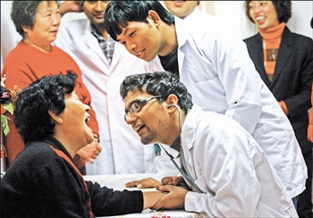天津北方网讯:昨天下午,和平区土山花园社区来了4位特殊的“客人”,他们是来自天津医科大学国际部临床医学院的尼泊尔留学生地利普、塔库、布达和桑寨,他们作为“家庭私人保健医生”,将为社区居民建立完善的家庭健康档案,提供家庭健康服务。地利普对记者说:“我们利用业余时间用所学知识为居民做点事情,使大家养成良好的健康生活方式,从而达到预防疾病发生的目的。”图为健康“洋管家”地利普(中)为新宜里66岁的高淑芬老人查体。本报记者庞 剑摄