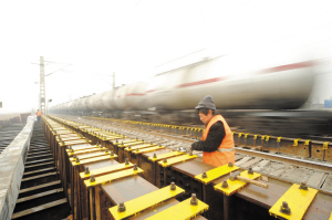 铁路桥位于东丽区大毕庄与山领子区间贯赤道下穿北环铁路处,该桥为两孔连体式框架结构,每孔净跨12米,主体长21.6米,重2700吨,铁路桥中心线与铁路中心线交角为82.4°,结构总高8米,净高6.3米。17日上午,在施工现场,随着技术人员的指令,在13台500吨级千斤顶作用下,重达2700吨的铁路桥缓缓移动。中午11点,“成功就位!”铁路桥历时7天,累计“行走”了38.1米,成功到达了预定位置,精准就位。记者看到,当列车从铁路桥上通过时,都是飞驰而过。据技术人员介绍,铁路桥顶板顶面距最低的钢轨底面仅0.8米,施工单位就是在如此条件下完成了施工。北环铁路每天通行列车160列,施工前将事先在铁路外侧预制好的桥体“顶推”到铁路线下方,其间列车只需慢行通过即可。记者王月通讯员肖博