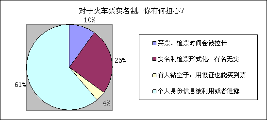 自2012年1月1日起,所有旅客列车火车票实名制购票验票乘车制度正式实行。对于这项与民生息息相关的政策,网友有着怎样的看法呢?调查显示,有61%的网友担心火车票实名制后,个人身份信息被利用或者泄露。