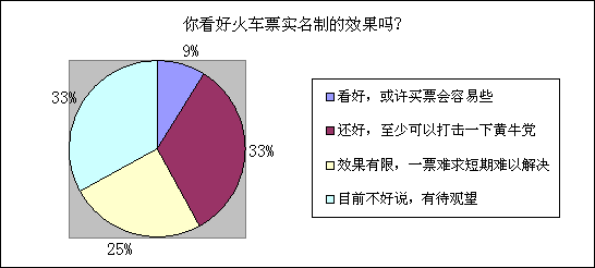 在“你看好火车票实名制的效果吗?”的调查中(见图2),33%的网友认为“目前不好说,有待观望”,33%的网友则认为“还好,至少可以打击一下黄牛党”,另有近9%的网友表示“看好,或许买票会容易些”。而25%的网友则明确表示不看好,认为火车票实名制“效果有限,一票难求短期难以解决”。