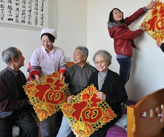 ●在春节到来之际,北辰区爱馨瑞景园老年公寓为不能回家过年而成为“留守”老人送上福字、吊钱、等新年礼物,弥补老人们无法回家过年的遗憾,为留守老人营造出一个亲情港湾。(上图)