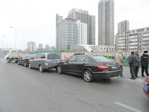 记者在现场看到,顺驰桥上桥处前方停着4辆车,4辆车发生了连环追尾,从前往后依次是小货车、奔驰280、奇瑞威麟和奔驰260。据货车司机讲,当时他的车前面有两辆车突然停车,他于是赶紧踩刹车,然后向左打轮,想绕开前面的车继续行驶,结果后面3辆车就撞了上来。事故造成顺驰桥由东往西车道上严重压车,一辆北京牌照出租车和一辆长罐车又发生了一起剐蹭事故。随后交警赶到现场,对交通事故进行处理,并对此处的交通进行了疏导。截至记者发稿时,事故具体原因仍在调查中。(记者杨雪菲)