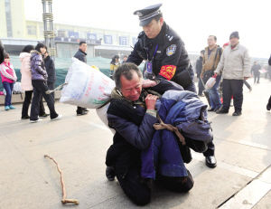| 1月8日,山西太原火车站,一位没有身份证的老农滞留车站广场,一民警帮他办理临时身份证、购票,老农才顺利上车。图为老农跪谢民警,民警帮老人扛好行李。 |