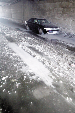 开车出门犹如“过山车”,这可不是在游乐场,而是在本市的一些地道和马路上。记者走访发现,本市多处地道和马路有结冰现象,让出行的市民着实捏把汗。