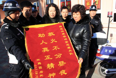 2月1日上午,家住北辰区宜兴埠镇宜鹏园社区的王女士及其家人拿着“救火不分昼夜,助人真正精神”的锦旗来到该镇治安巡逻队,感谢巡逻队员在除夕之夜帮助她家扑灭火情,避免财产严重损失的义举。