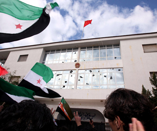 ●昨日,一批叙利亚和利比亚的民众,聚集在中国驻利比亚首都的黎波里的大使馆外,抗议中国否决安理会关于要求叙利亚总统巴沙尔下台的决议案。(上图)