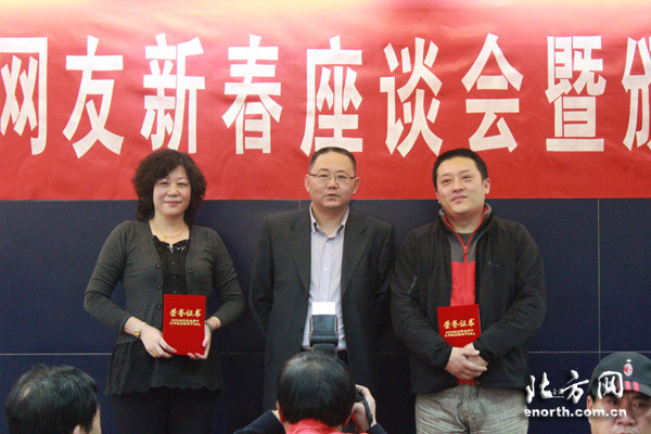 天津北方网讯:2月11日下午,“北方论坛网友新春座谈会暨颁奖仪式”在北方网举行,来自天津四面八方的网友代表们齐聚一堂、热烈交谈,为北方论坛未来的发展出谋划策。会上举行了“北方论坛2011年度特殊贡献奖”、“2011天津十大拍客事件”的颁奖仪式,并为“网友记者团”资深网友记者和高级网友记者颁发了证书。会上还宣布,由北方网主办的2012年“镜头中的民心工程”系列主题拍客活动与“身边好人道德之光”活动正式启动。