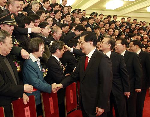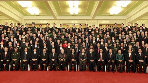 | 2月14日上午,中共中央、国务院在北京隆重举行国家科学技术奖励大会。党和国家领导人胡锦涛、温家宝、李长春、李克强出席大会并为获奖代表颁奖。会前,胡锦涛等党和国家领导人会见获奖代表并合影。 |
