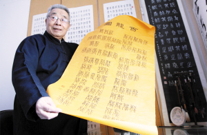 昨天,记者在李士笙老人家看到整幅图长约1米、宽有半米,由100个“龙”字组成一个大的篆字“龙”。不同于一般书法的是,老人是用美术字的写法,将每一个小的“龙”字进行“再加工”,不断地变换写法。100个“龙”字绝对不重样。李老说,他曾看到过“百龙图”“百寿图”,也曾试着写过,今年正值龙年,便想进一步挑战一下,用100个“龙”字拼成一个字,难度也就更大了。在李老看来,收集并创作100个“龙”字并不是最难的,倒是怎样将其凑成一个篆字“龙”比较费事,“要先打草稿,画格后再标号,反复试验,直到整个‘龙’字看上去协调好看。”记者看到,整幅图中,不乏一些基本无法识别的字,有几个字更是用图画的形式表现的。李老指着一个看似小动物的字说:“这下面是水,而上面又有角,都是取的龙的特征。”整幅篆字“龙”,分为左右两部分,李老特意将形态相近或是结构雷同的放在一行或是一列上,这样整幅图看上去也更有规律、更协调。而说到为何要创作“百龙图”,李老表示,中国自古就有龙文化的传承,这龙年的“龙抬头”更是意义非凡,所以要为大家献份年礼。记者佟芳摄影谷岳