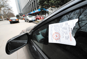 27日,南京长江路边一辆违停轿车被贴上罚单,而附近仍有车辆违章停车。新华社发