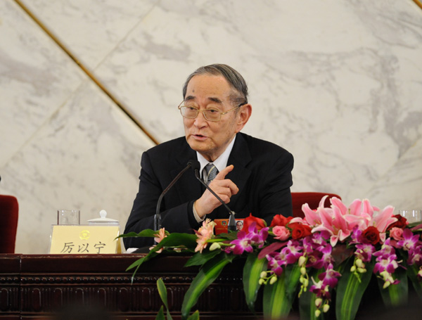全国政协于3月6日15时在人民大会堂一楼新闻发布厅举行主题为“稳中求进,推动经济社会科学发展”的记者会,邀请全国政协委员厉以宁、许善达、陈锡文、马秀红、杨凯生、任洪斌围绕经济发展问题回答中外记者提问。图为厉以宁委员回答新华社记者提问。陈竞超摄