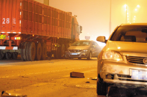 昨天0:30左右,在河东区富民路上发生一起车祸。一辆海马轿车刚从富民桥下桥,就撞上了道旁的隔离墩,造成前保险杠变形,水箱漏水。记者孙瑜见习记者王月焜