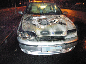 本报讯(记者韩爱青文并摄)昨日零时左右,在河西区黑牛城道金星里小区门口,一辆行驶中的菲亚特轿车右前大灯突然起火,多亏小区一位居民打水奋力扑救,赶在消防人员到场前扑灭了火,保住了车。