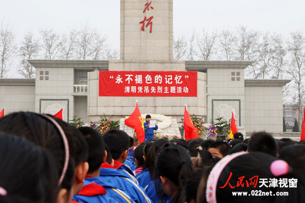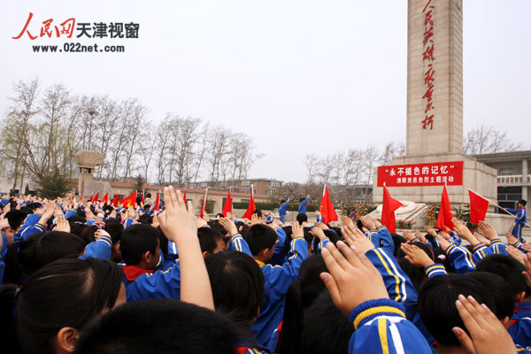 3月29日,西青区烈士陵园的纪念广场上,一场以“永不褪色的记忆”为主题的清明凭吊先烈活动举行,来自西青实验小学的800名学生和60名教师在这里缅怀先烈、祭奠英雄。(摄影:聂爽)