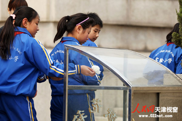 西青实验小学的学生们纷纷将别在胸前的小百花摘下,投入鲜花箱中。箱中的花朵逐渐增多,那一朵朵小花,是学生们对烈士的纪念。时光荏苒,没有人忘记那些长眠泥土中的烈士们,对先烈的纪念永不褪色。(摄影:聂爽)