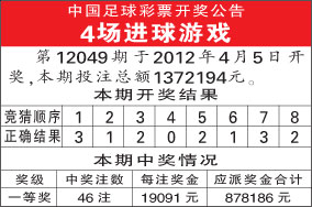 中国足球彩票4场进球游戏第12049期开奖公告