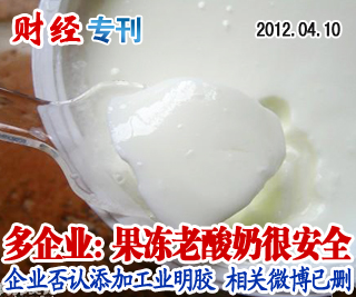 ●对于微博猜测,有些老酸奶中也含有工业明胶,一家大型乳企相关负责人表示,这种情况可能小企业会有,但大企业绝不可能。据悉,目前国内生产老酸奶的几个品牌奶企,添加的明胶都是食用明胶。