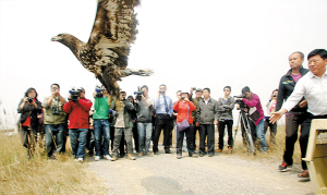 “慢点,慢点,大伙儿都离远点,可别吓着它们。”销毁完捕鸟网后,天津市野生动物救护驯养繁殖中心工作人员刘洋打开鸟笼,16只国家一、二级保护鸟类玉带海雕、灰鹤、斑嘴鸭等重返蓝天。“这些珍稀候鸟是在去年迁徙途中不幸受伤被好心市民救助的,经过救护中心的精心养护已经痊愈,并已具备野外生存能力。”刘洋告诉记者。