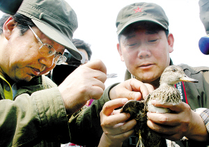 | 志愿者正在为粘在网具上的一只绿翅鸭细心清除身上的网线。 |