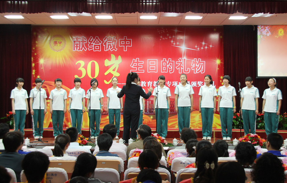 初二年级的学生代表表演了小合唱,她们唱起微中人最熟悉的校歌《微山路中学,我们的骄傲》,悦耳的歌声感染着在场师生。